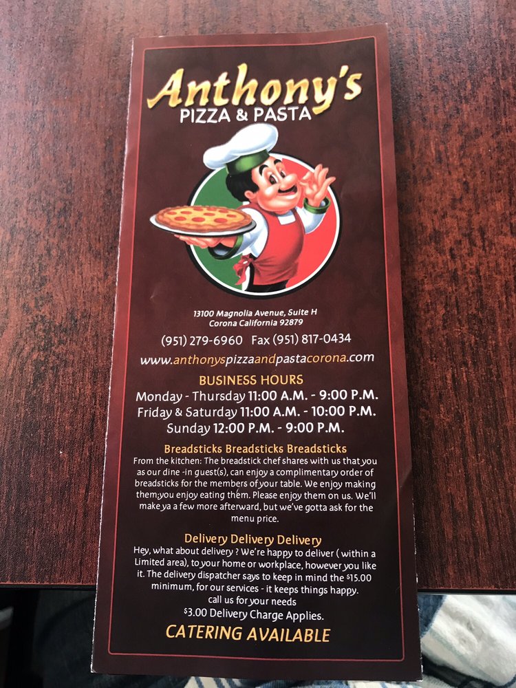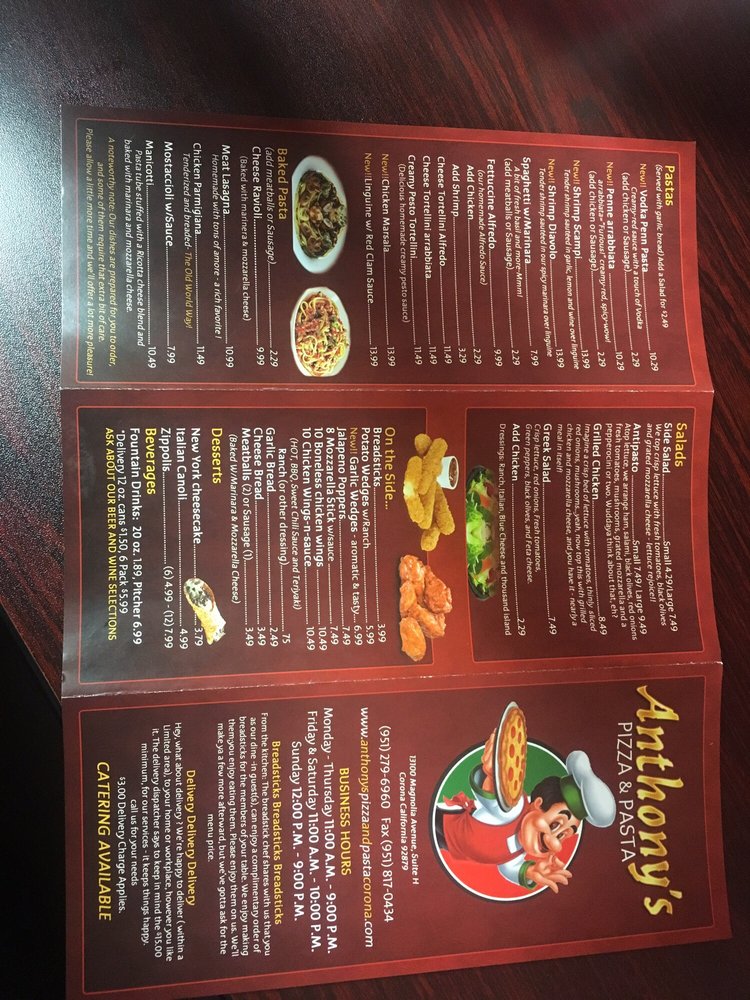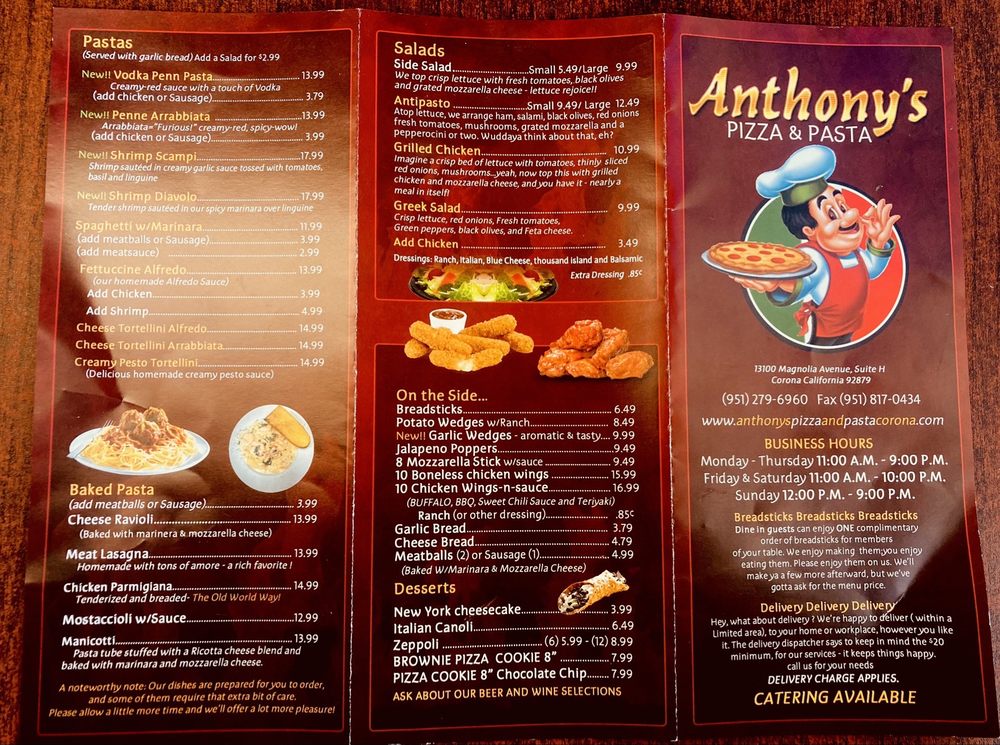 Introducing the menu at Anthony’s Pizza & Pasta, located in Corona, CA, where they offer a variety of options for every palate. From fresh salads like the Side Salad and Antipasto Salad to hearty Cold and Hot Subs, there's something for everyone. Customers rave about the quality and taste of the food, with reviews mentioning the delicious pizzas, stuffed jalapeños, and generous portions of wings. The crust is thick and fluffy, the toppings plentiful, and the sauce flavorful. The restaurant also offers a family meal option, perfect for feeding a group. Don't forget to try the cannoli for a sweet ending to your meal. Overall, Anthony’s Pizza & Pasta is a go-to spot for classic, old-school pizzas and flavorful Italian dishes.